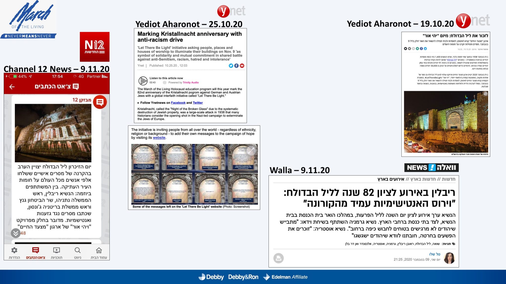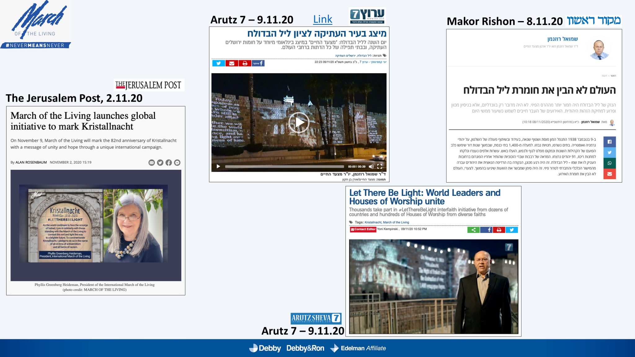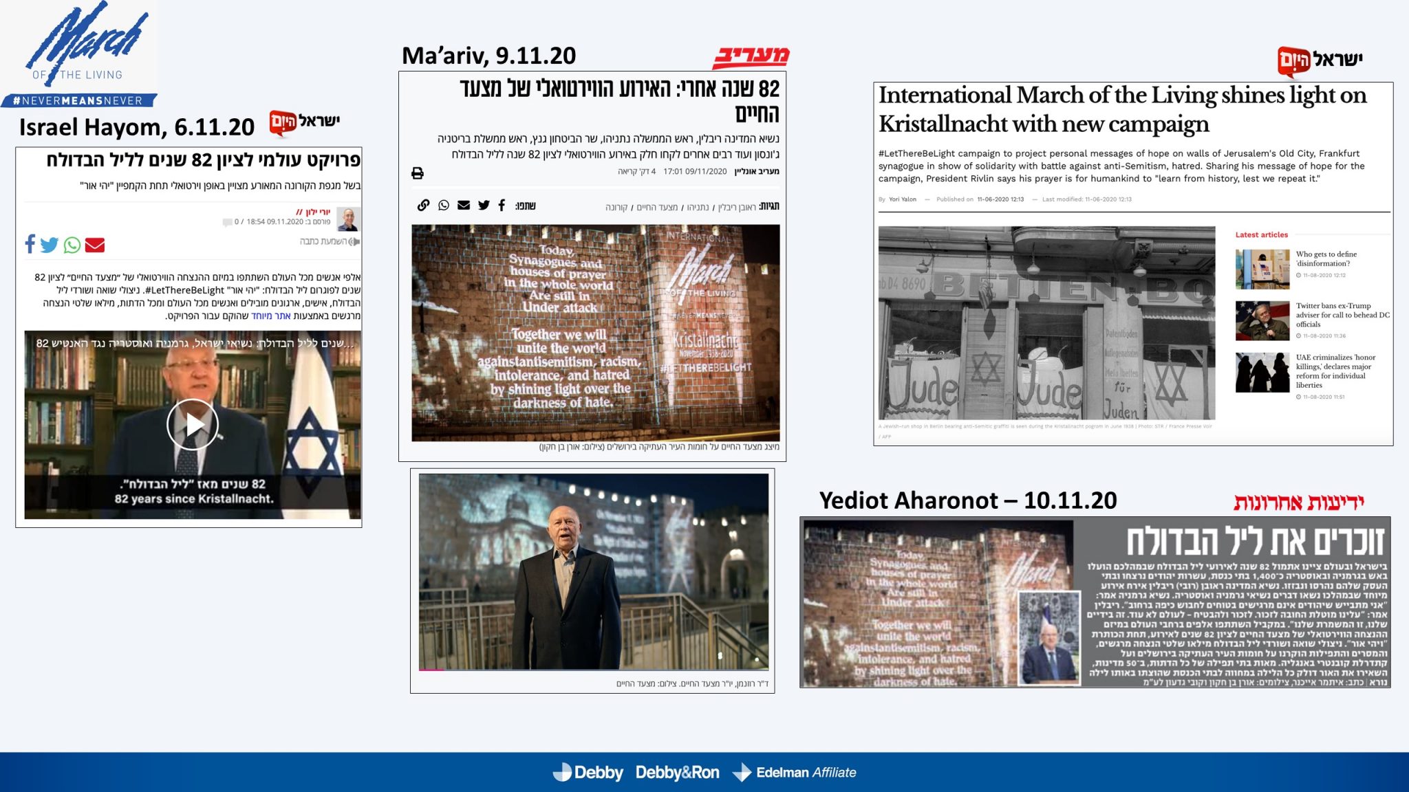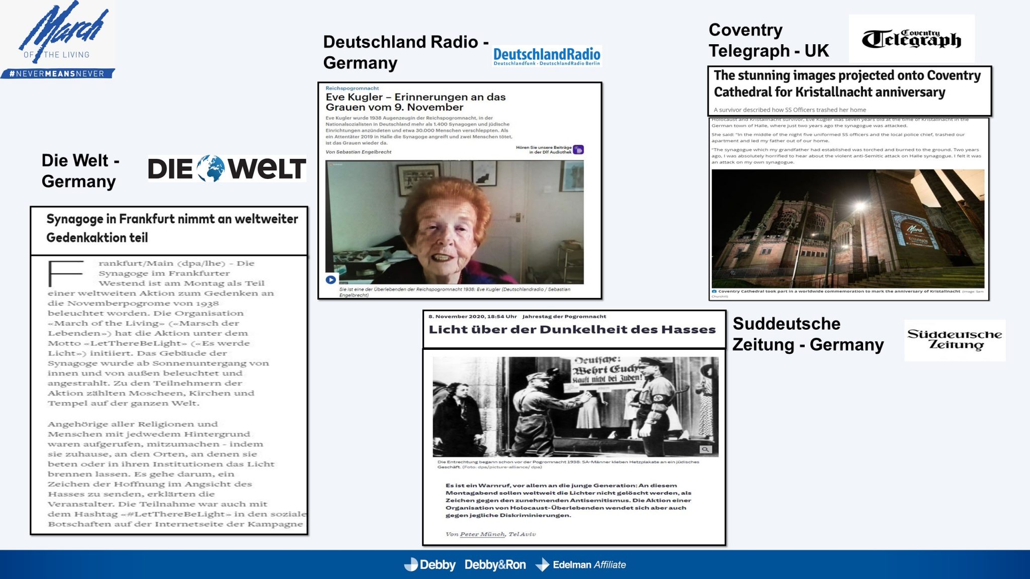 השלטים האלו הוקרנו בערב יום הזיכרון לליל הבדולח על חומות העיר העתיקה בירושלים, על בית הכנסת המרכזי בפרנקפורט ועל קירות קתדרלת קובנטרי באנגליה.