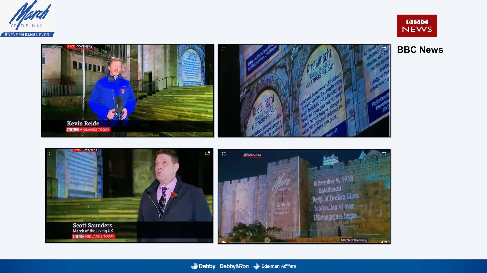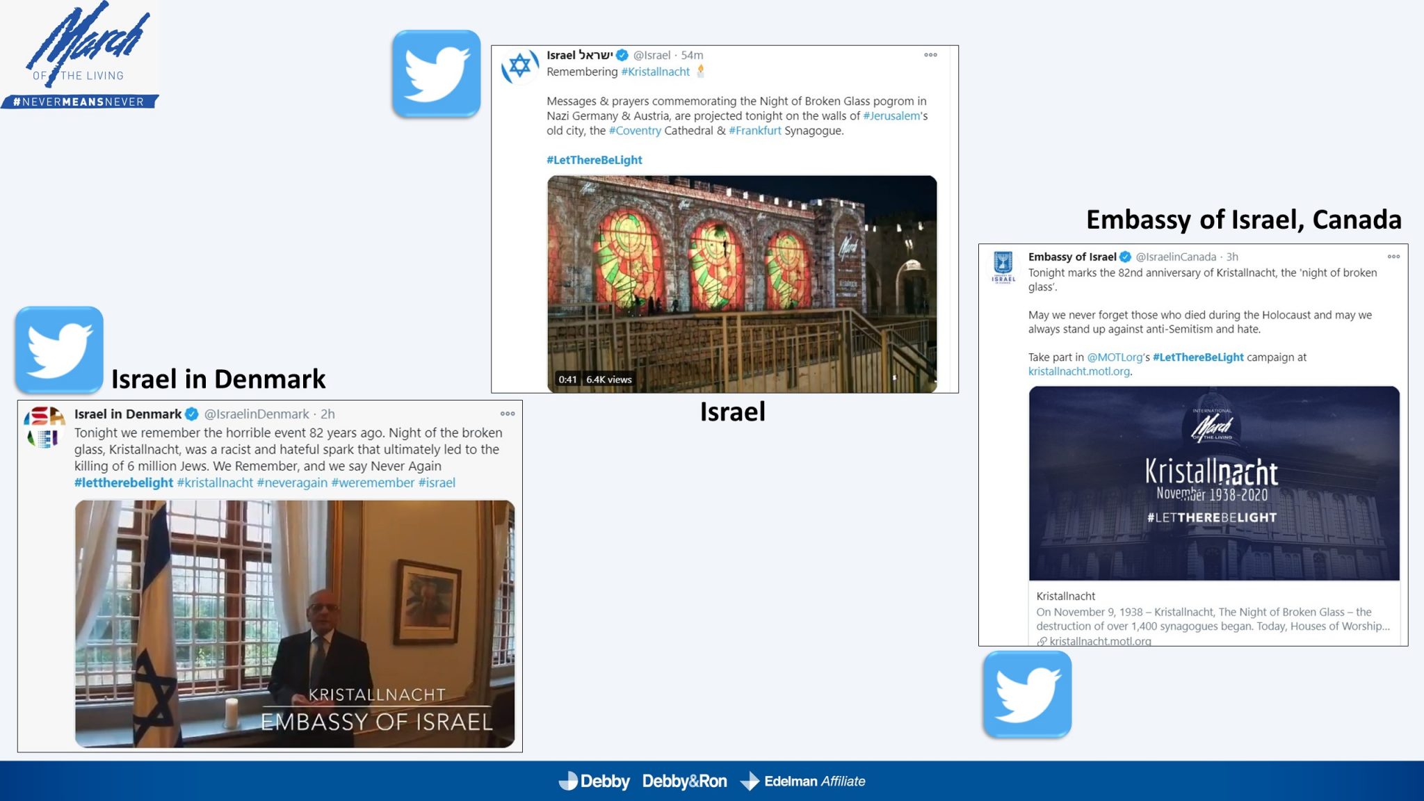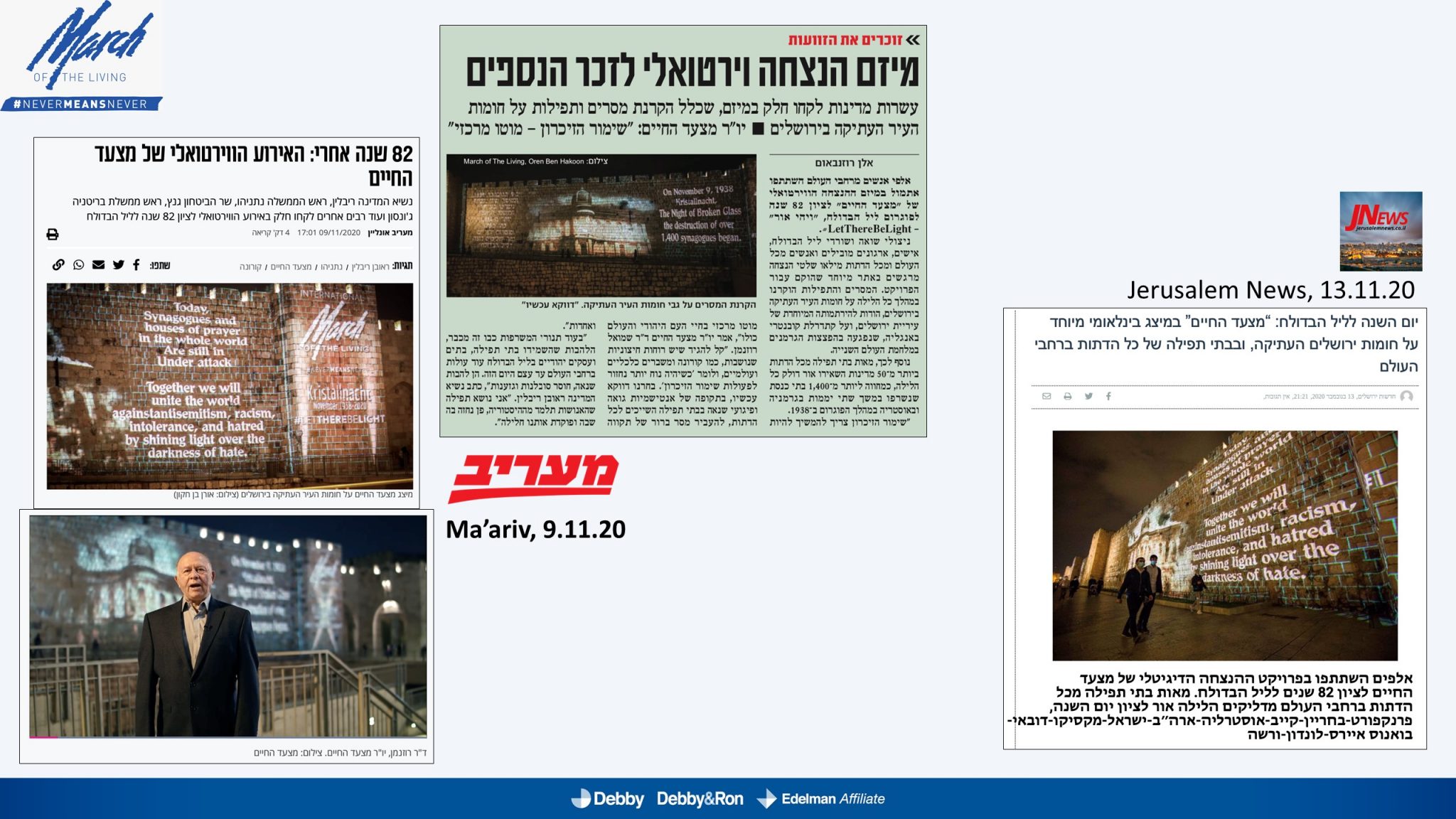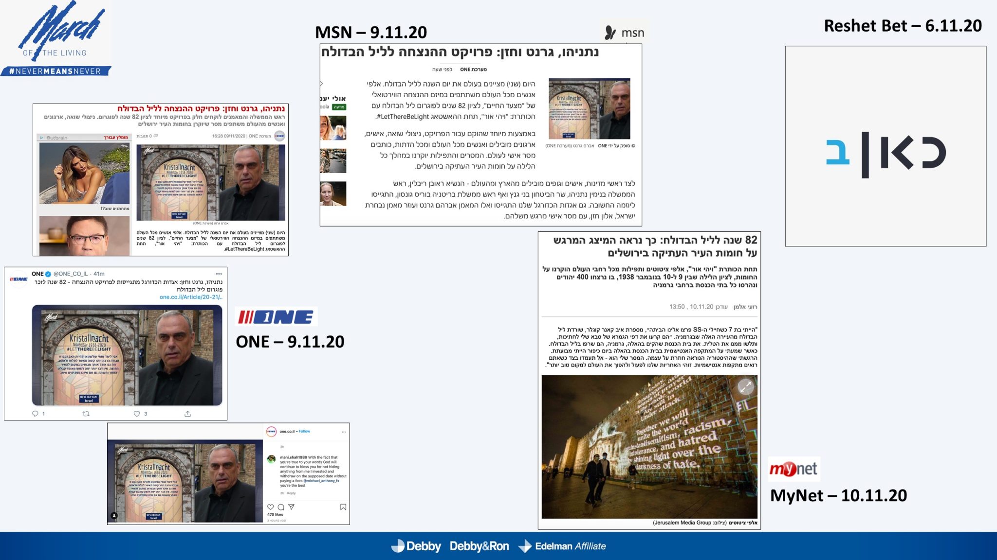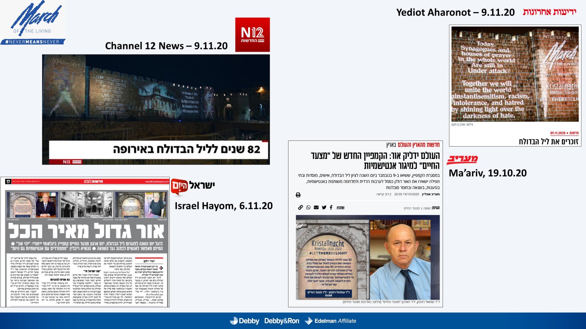 השלטים האלו הוקרנו בערב יום הזיכרון לליל הבדולח על חומות העיר העתיקה בירושלים, על בית הכנסת המרכזי בפרנקפורט ועל קירות קתדרלת קובנטרי באנגליה.