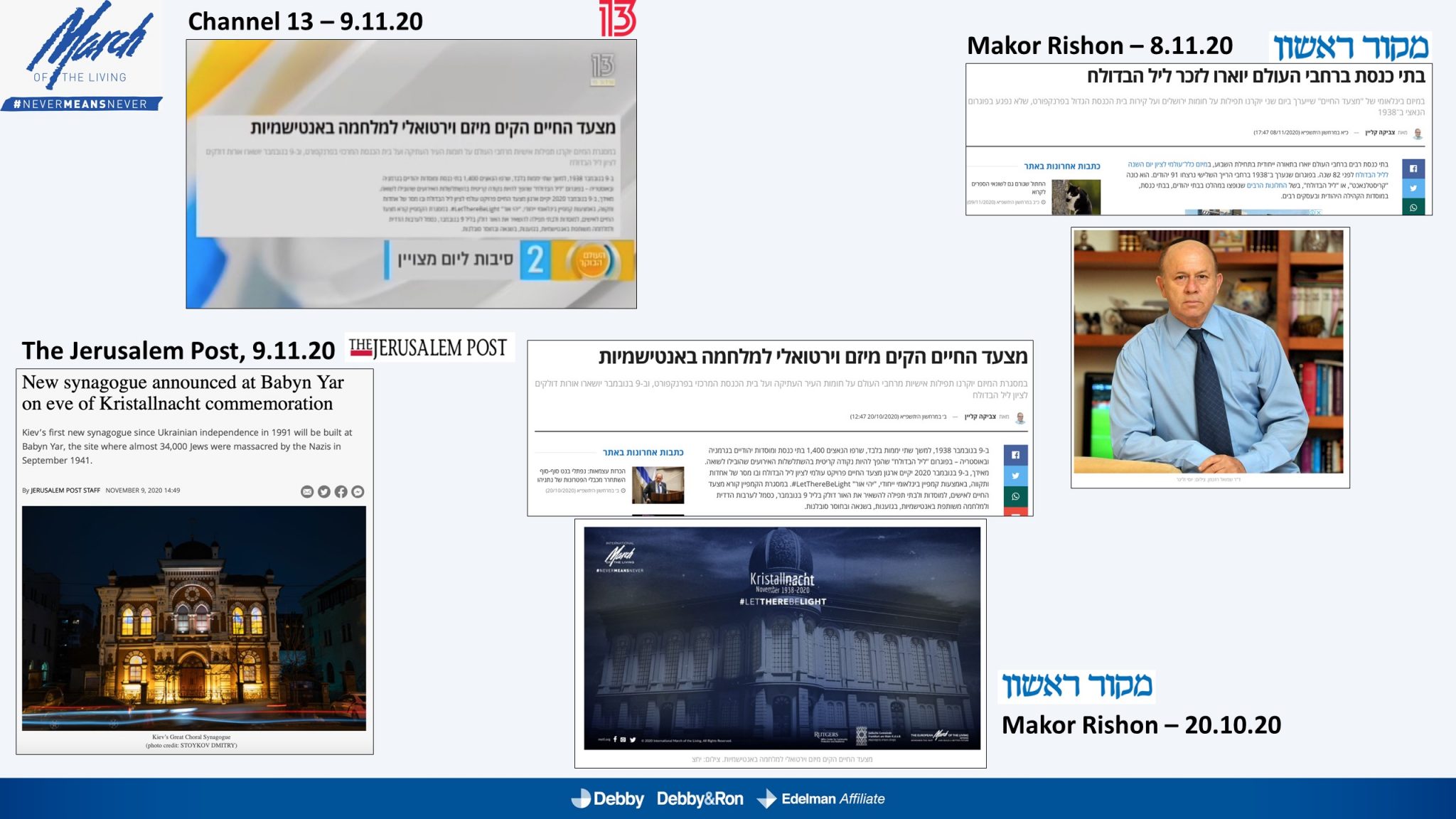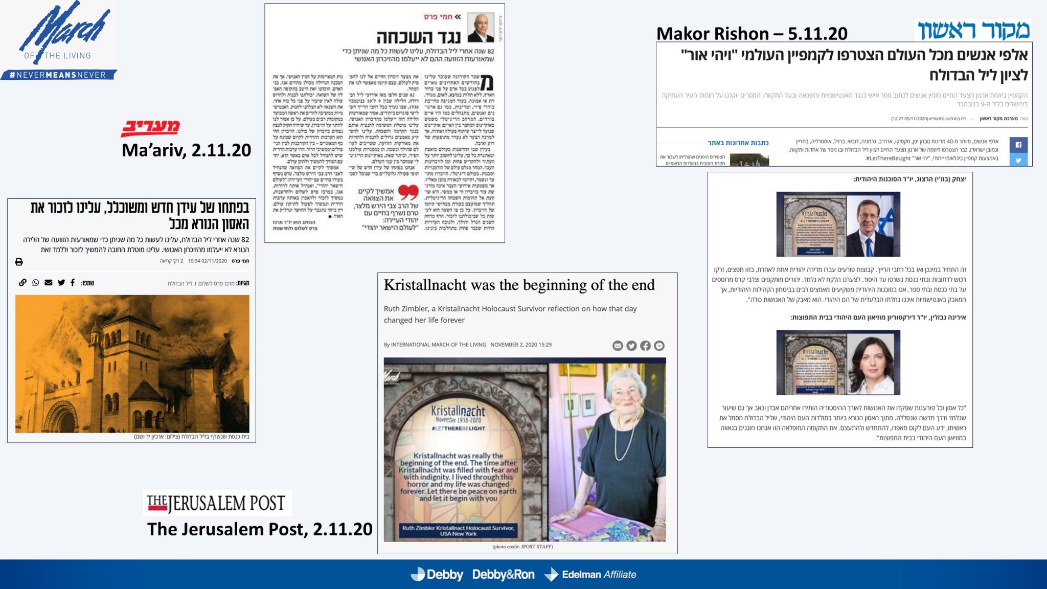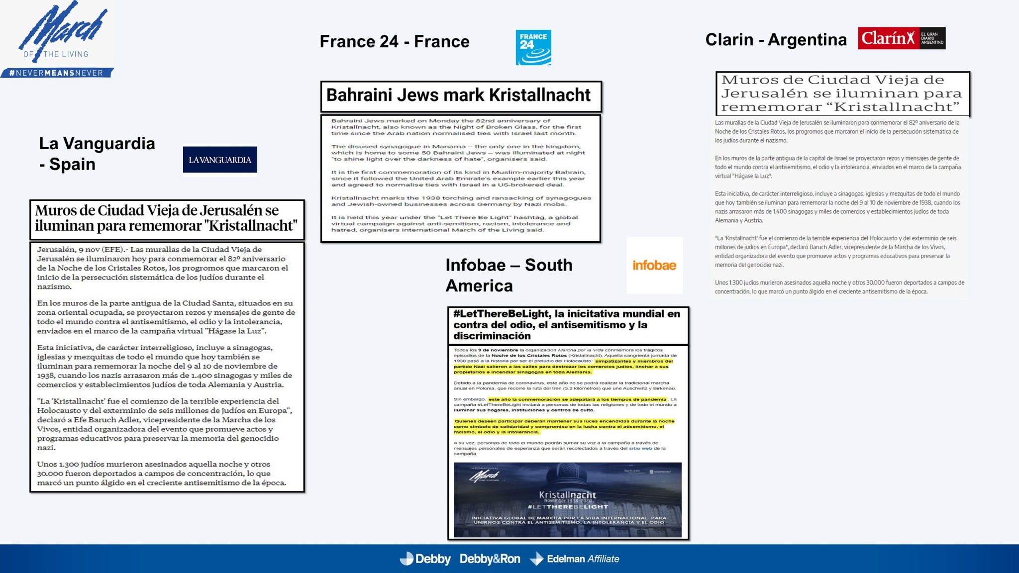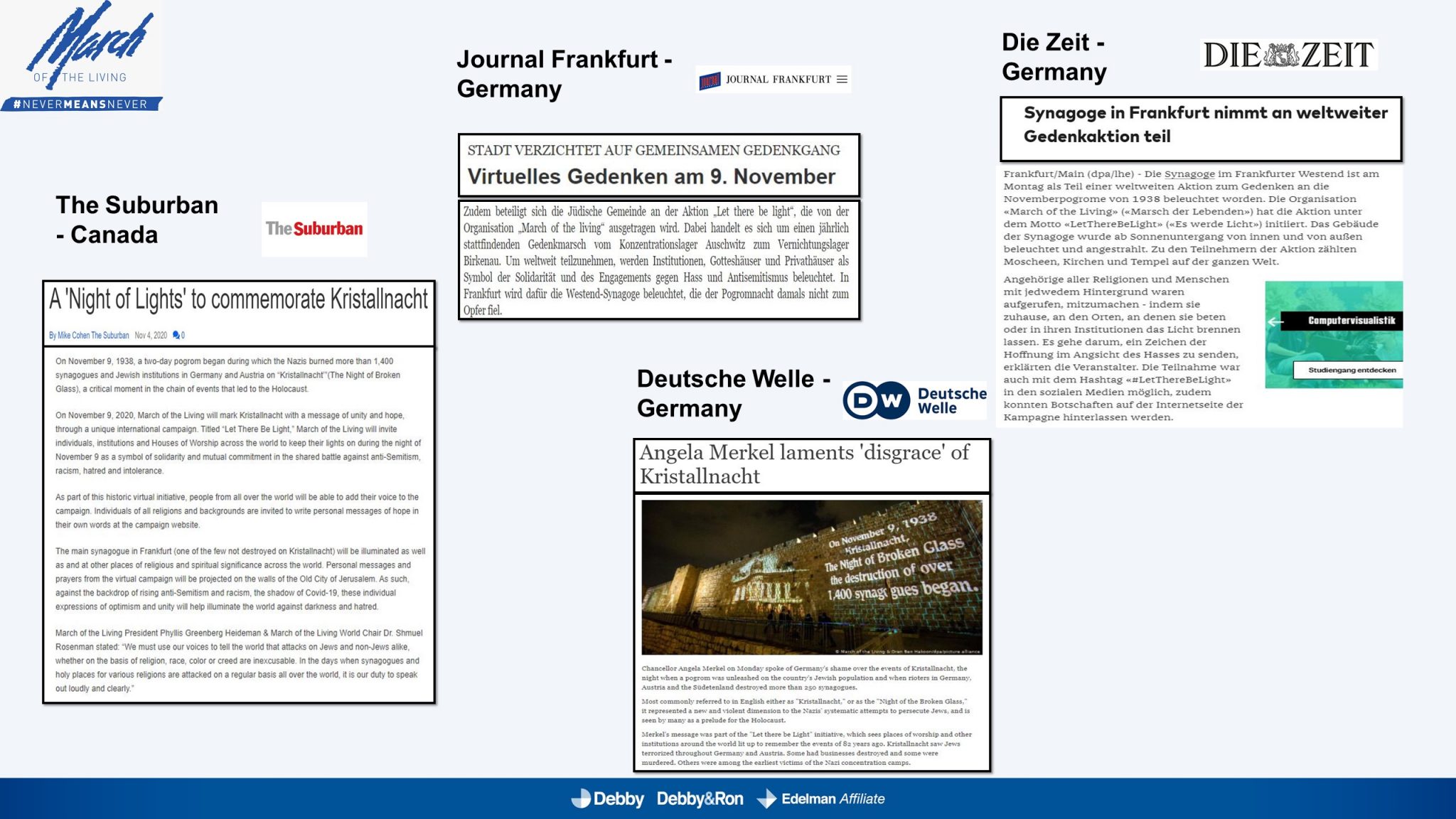 השלטים האלו הוקרנו בערב יום הזיכרון לליל הבדולח על חומות העיר העתיקה בירושלים, על בית הכנסת המרכזי בפרנקפורט ועל קירות קתדרלת קובנטרי באנגליה.