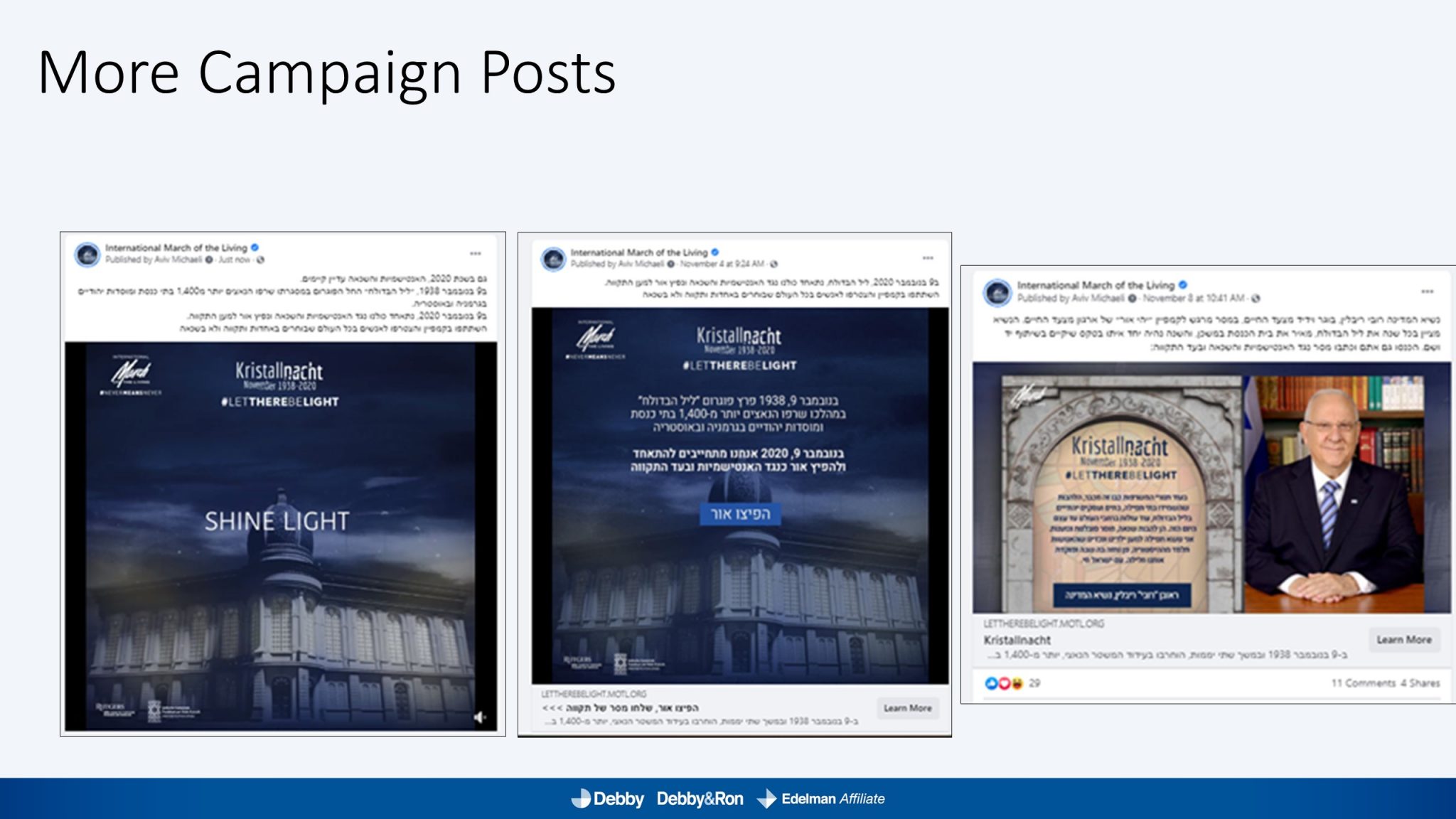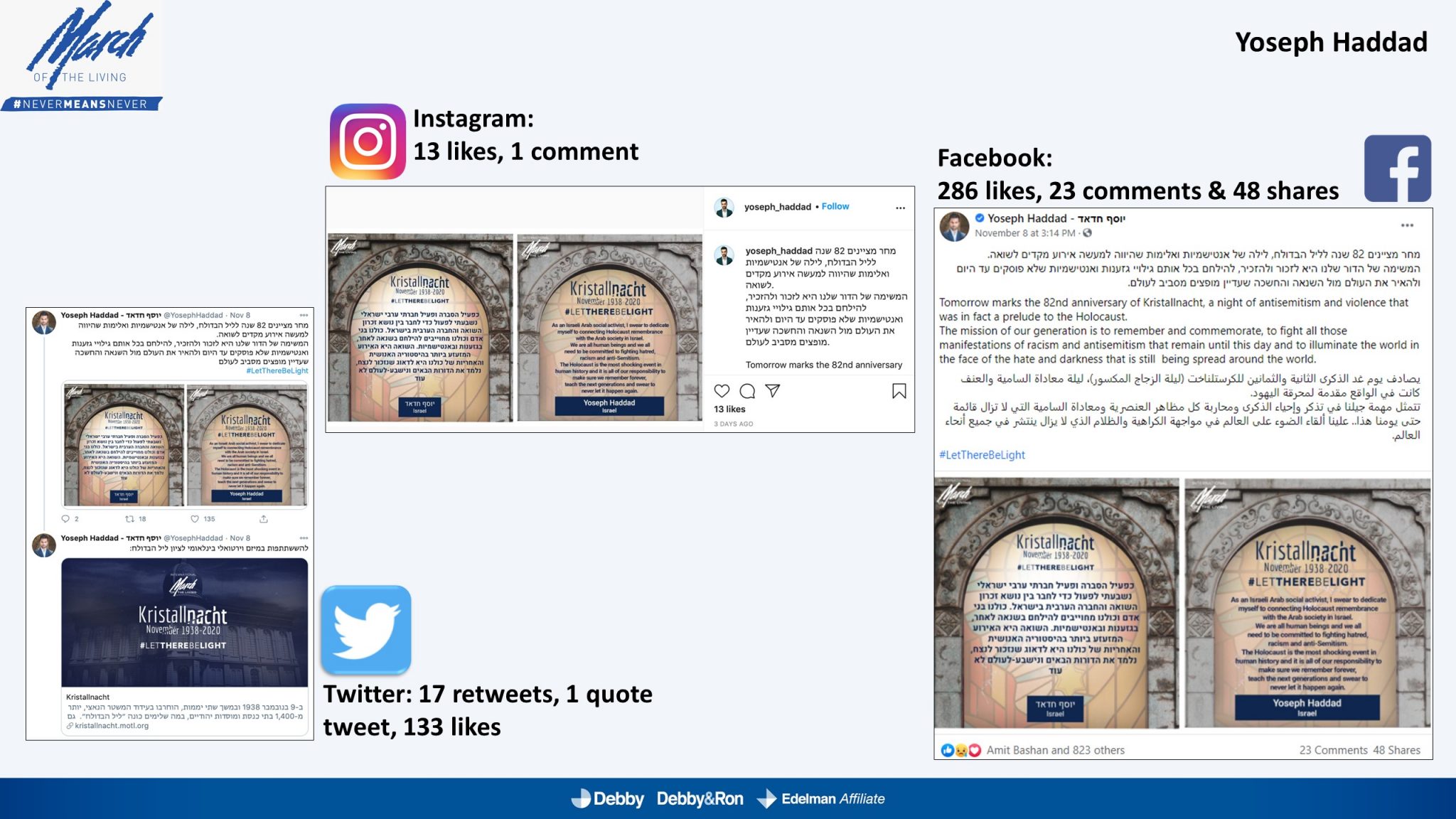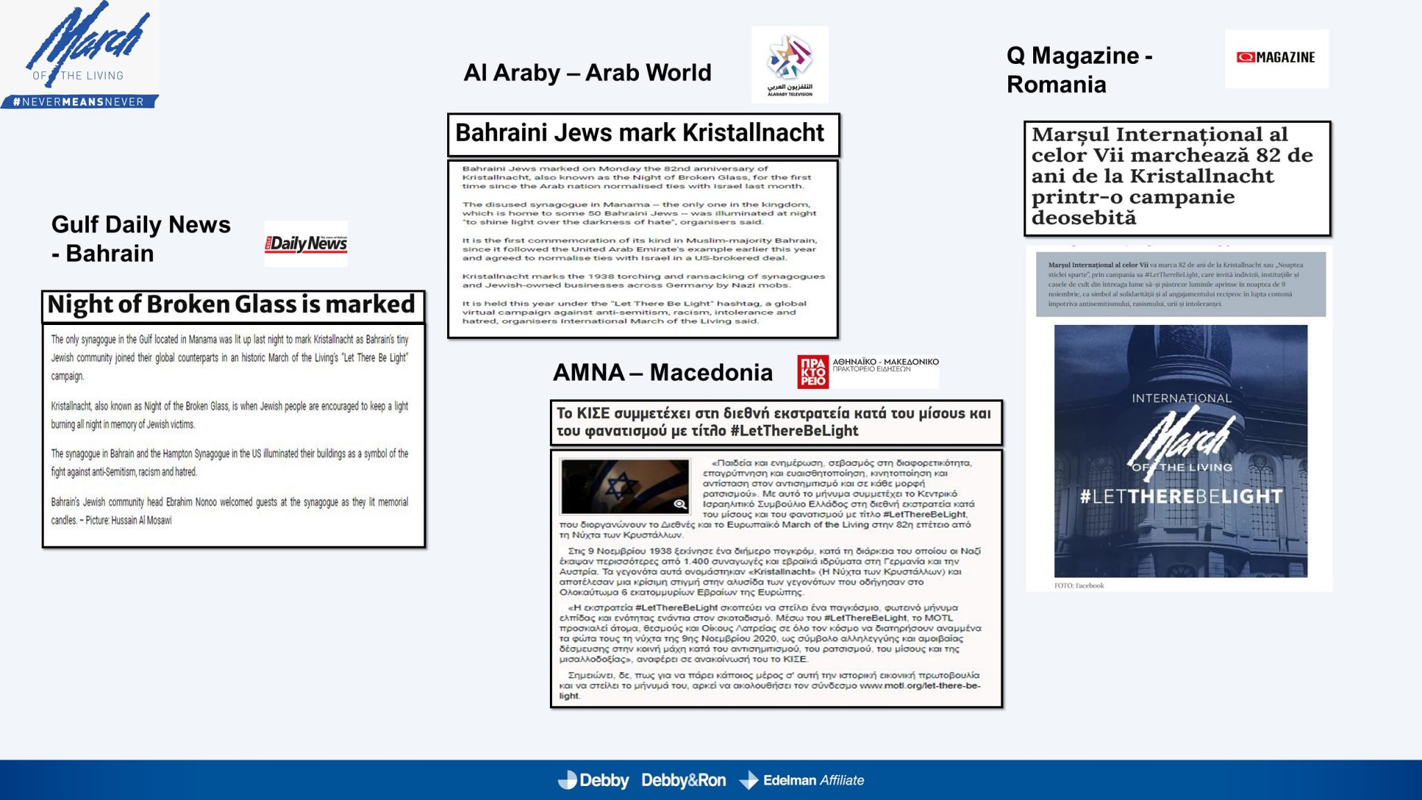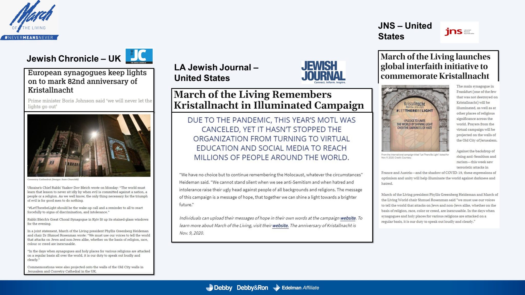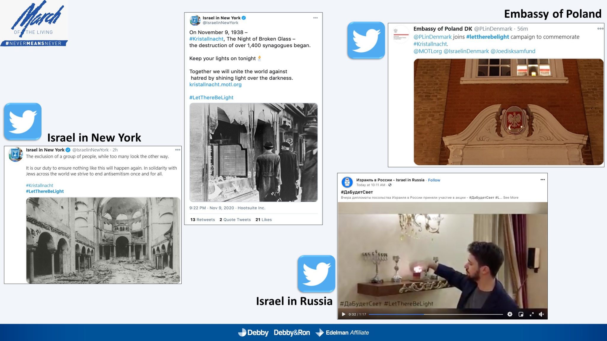 השלטים האלו הוקרנו בערב יום הזיכרון לליל הבדולח על חומות העיר העתיקה בירושלים, על בית הכנסת המרכזי בפרנקפורט ועל קירות קתדרלת קובנטרי באנגליה.