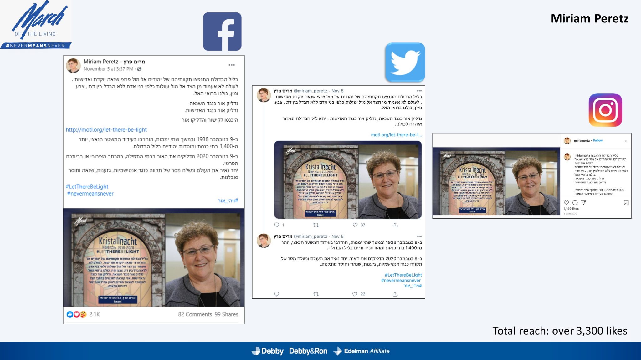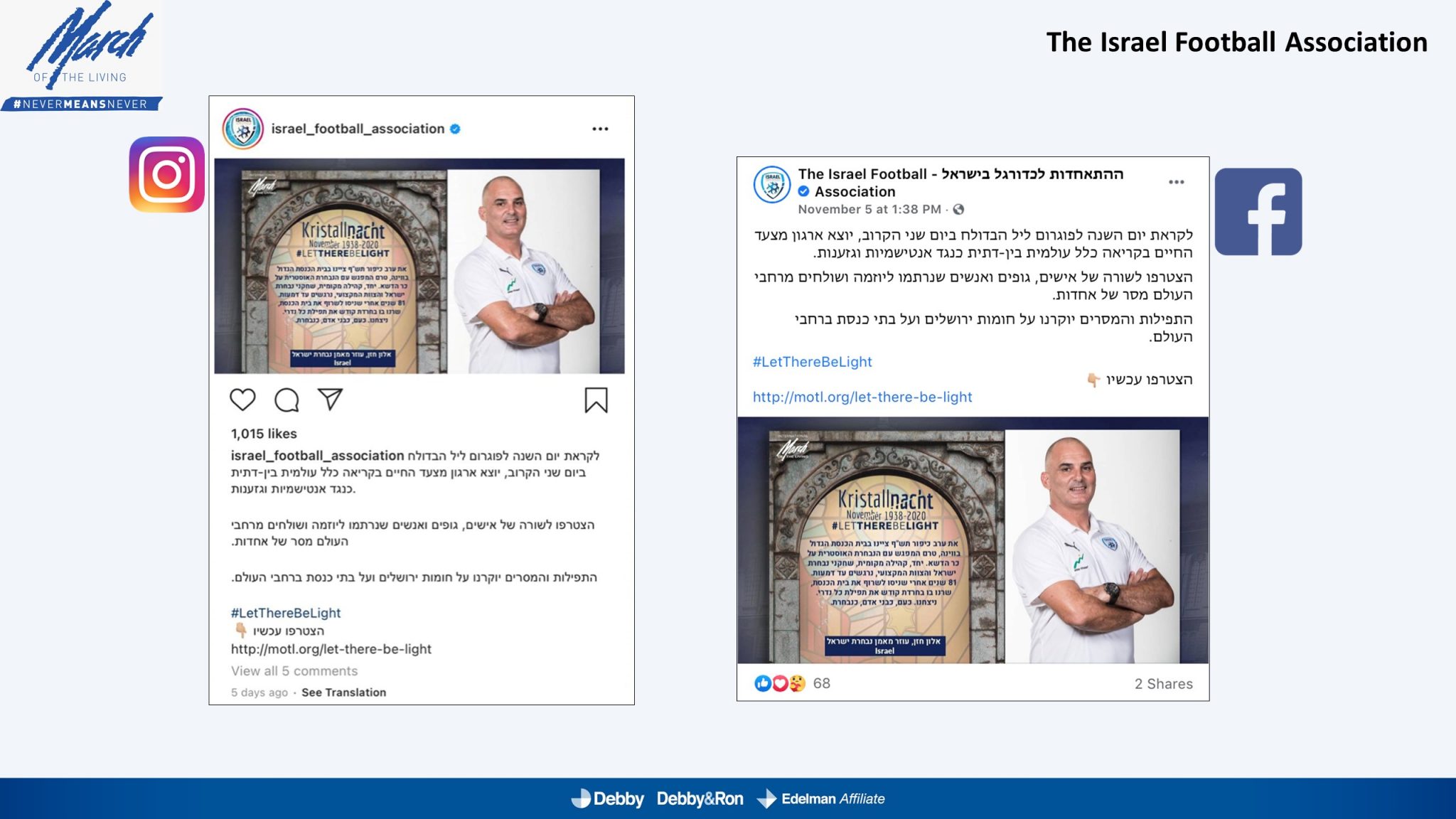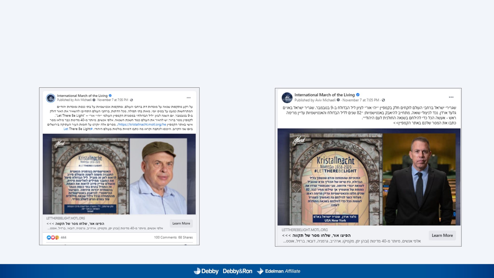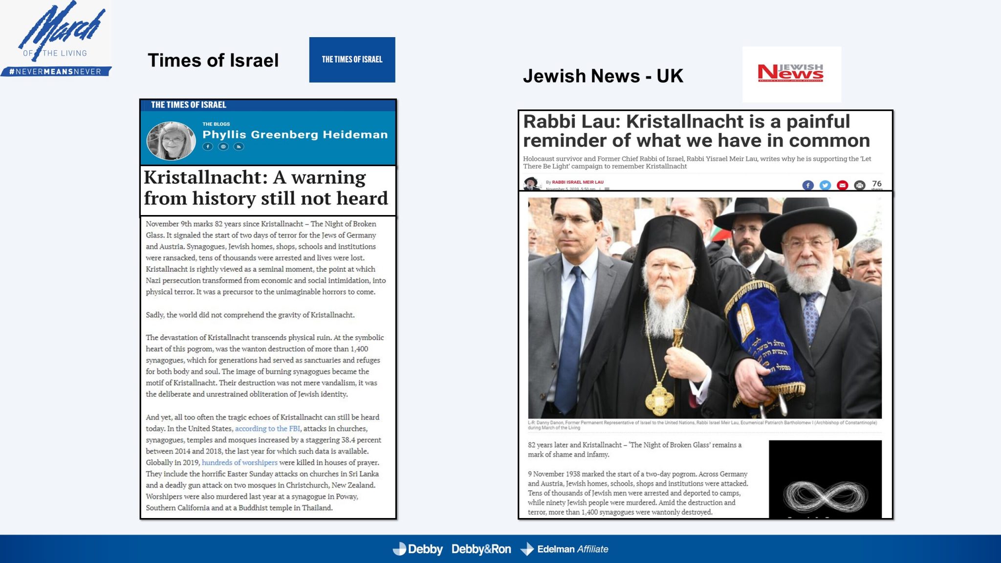 השלטים האלו הוקרנו בערב יום הזיכרון לליל הבדולח על חומות העיר העתיקה בירושלים, על בית הכנסת המרכזי בפרנקפורט ועל קירות קתדרלת קובנטרי באנגליה.