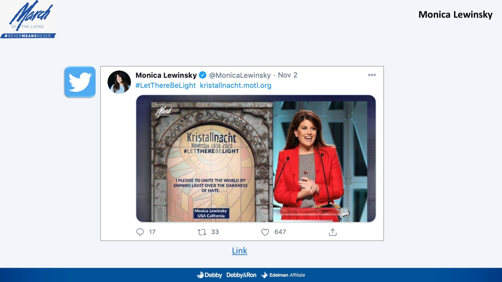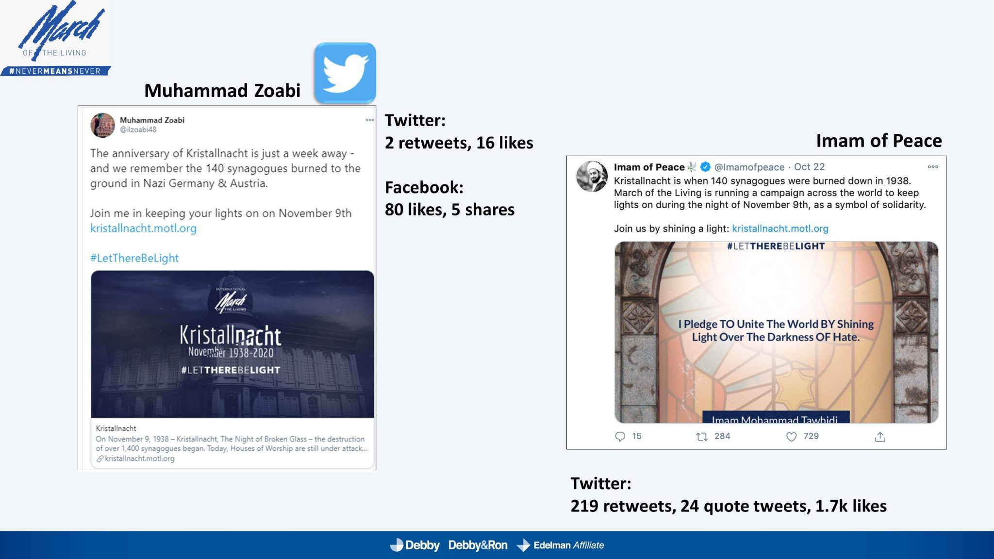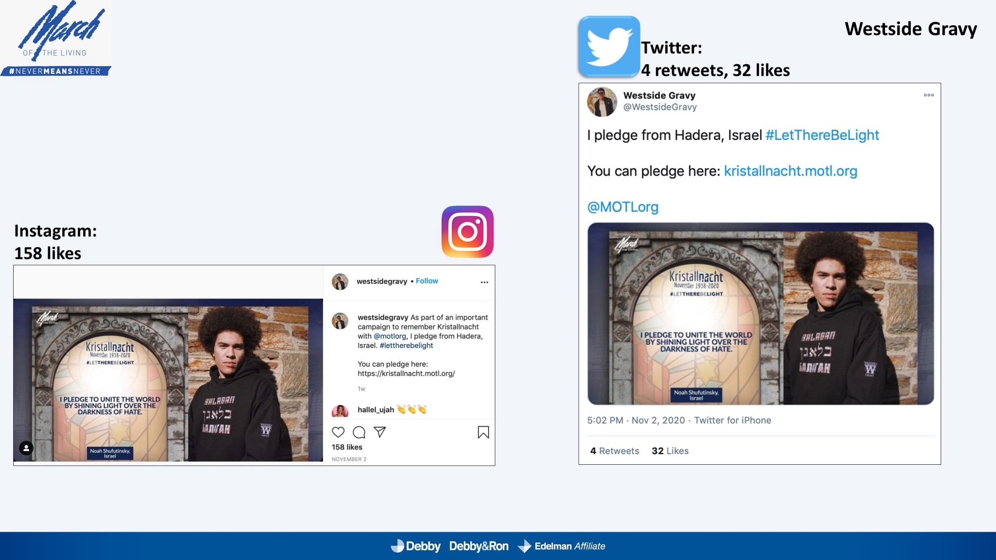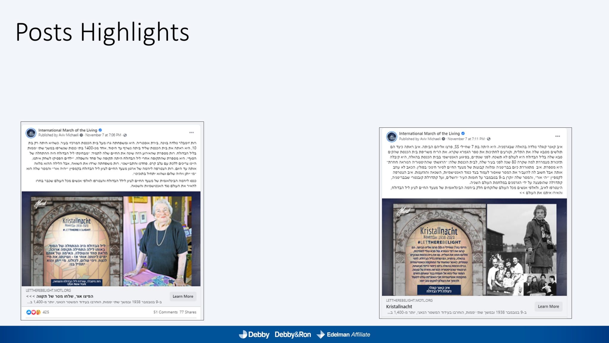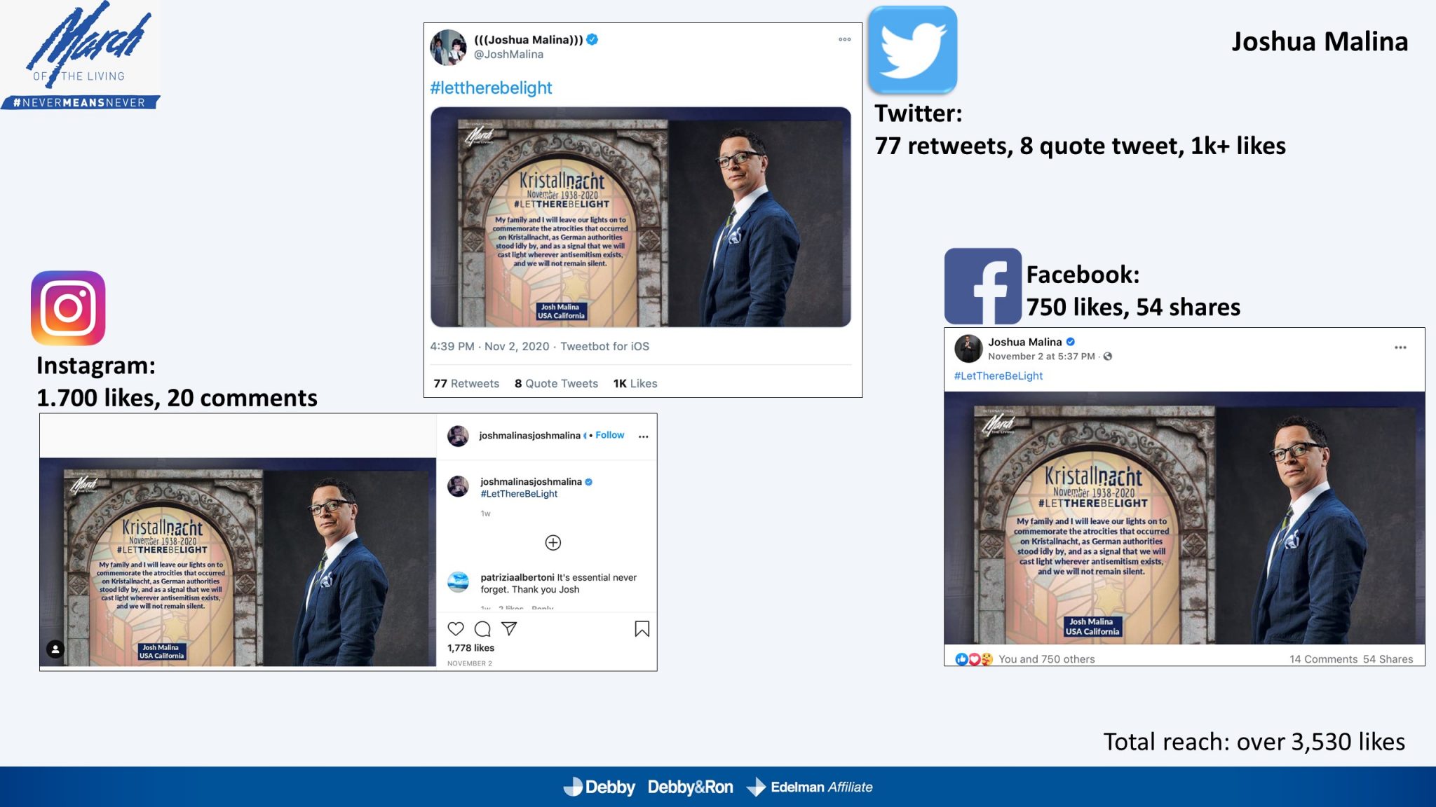 השלטים האלו הוקרנו בערב יום הזיכרון לליל הבדולח על חומות העיר העתיקה בירושלים, על בית הכנסת המרכזי בפרנקפורט ועל קירות קתדרלת קובנטרי באנגליה.